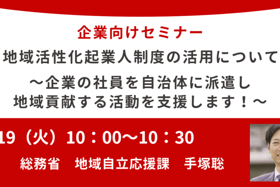 総務省の担当者が登壇し、セミナー「地域活性化起業人制度の活用について ~企業の社員を自治体に派遣し、地域貢献する活動を支援します!~」を開催します。